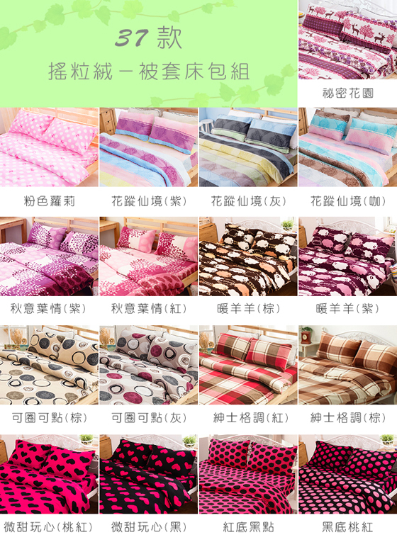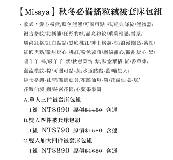 商品訊息簡述: 只要690元起(含運)即可購得【Missya】原價最高1680元秋冬必備搖粒絨被套床包組系列任選1組:(A)單人三件式/(B)雙人孕韟?(C)雙人加大孕韟﹛C皆有多種款式任選!